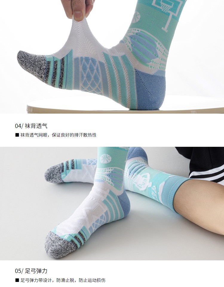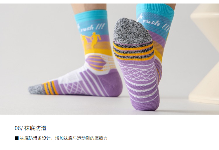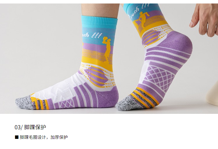 缓震耐磨:袜底加厚设计(如毛巾底结构),增强落地缓冲,降低长时间运动对脚踝和膝盖的冲击;脚趾、脚跟部位强化耐磨处理,延长使用寿命